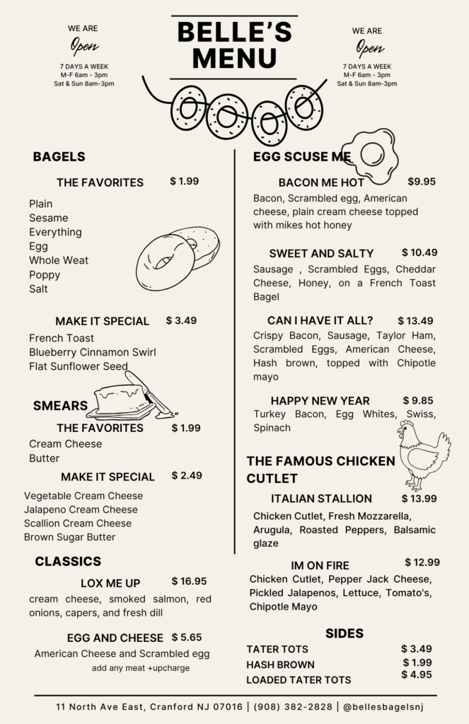 “We want Belle’s Bagels to be a neighborhood spot,” said Cayla. “It’s our goal to have a place in Cranford where everyone feels welcome and you can expect to run into people that you know.” Belle’s Bagels opens at 6am on weekdays, making it the perfect early morning stop for commuters before they start their day. Cayla and Dave currently plan to open at 8am on Saturday and Sunday, though the hours may change in the future.