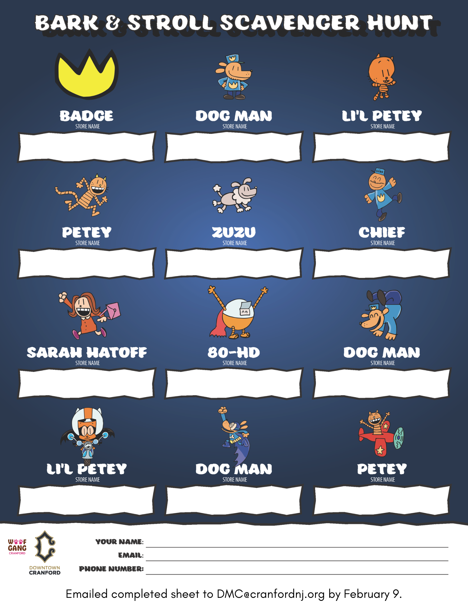 To celebrate the Dog Man movie (now playing at Cranford Theater), Downtown Cranford presents the Bark & Stroll Scavenger Hunt! If you can find all of the characters in this scavenger hunt in storefront windows throughout Downtown Cranford, you can win a $25 Downtown Cranford gift card, sponsored by Woof Gang Bakery! Completed scavenger hunt sheets can be submitted by emailing them to DMC@cranfordnj.org. Entries must be received by February 9th.