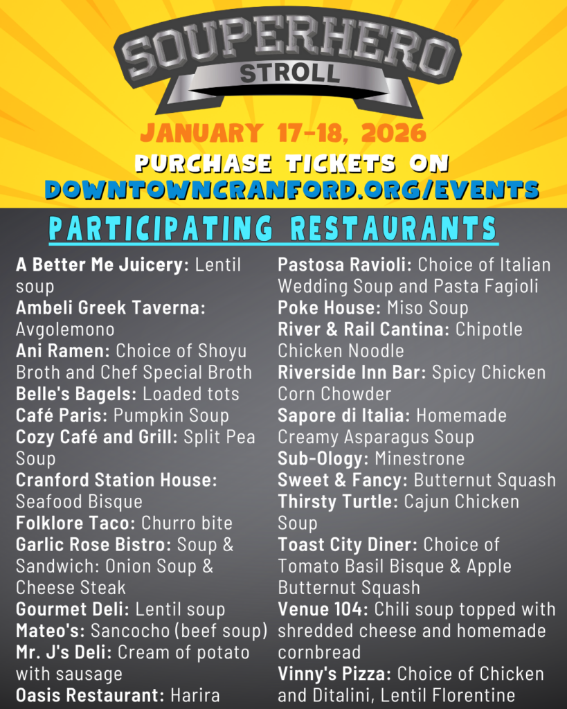 This weekend, January 17-18, is the Downtown Cranford Souperhero Stroll! 24 Downtown Cranford restaurants will be dishing out delicious, homemade soups as part of this weekend’s Souperhero Stroll but you need a ticket to take part in the fun! Tickets can be ordered on the Downtown Cranford Eventbrite page here: https://bit.ly/4q5VW0v. There will also be 40 superhero balloons all over Downtown Cranford for people to see and enjoy!