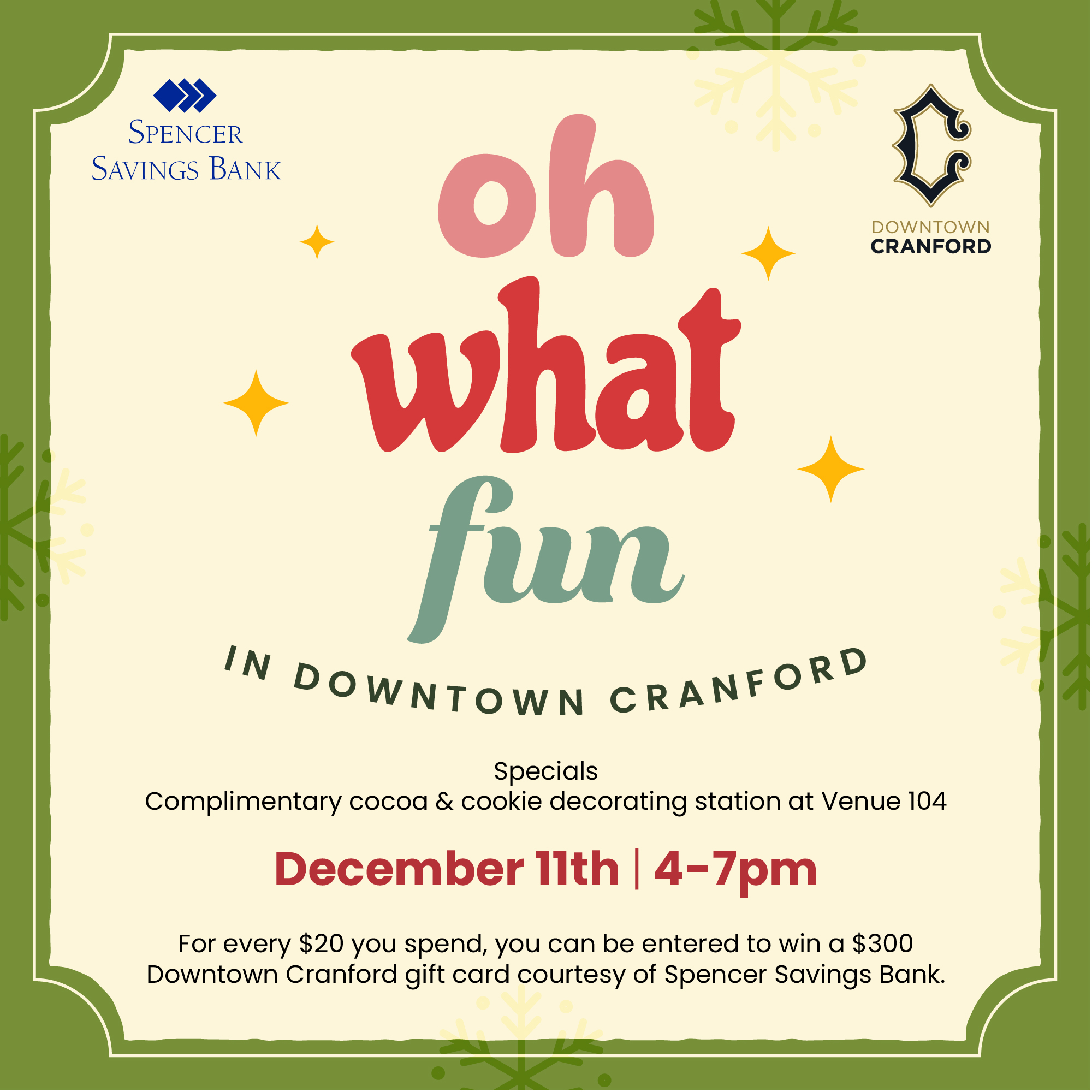Join us for Oh What Fun! on Thursday, December 11th from 4-7PM! Venue 104 will be hosting complimentary cocoa and a cookie decorating station for everyone to enjoy. While you’re downtown, we invite you to shop and dine – for every $20 you spend during the event, you’ll be entered to win a $300 Downtown Cranford gift card, courtesy of Spencer Savings Bank!